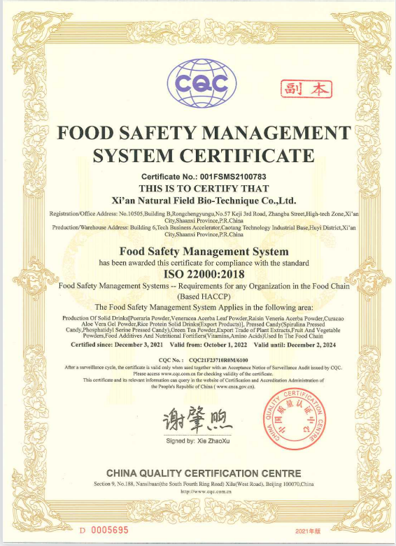 生產基地位于西安科技企業加速器B區草堂工業園。擁有標準化車間,標準提取物、健康食品原料以及化妝品原料的生產線,目前獲得專利10多項,多個產品取得了HACCP、HALAL、ISO9001、KOSHER、歐盟有機證、美國有機證等多項證書。